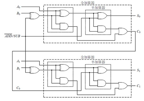 下記の2ビットの加減算回路の真理値表を完成させなさい。 入力A(A 1 A 0),B(B1 B0)とし,A +B の加算時は